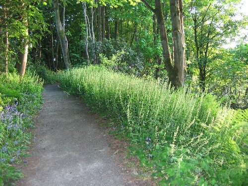 The picture on the left shows the part of the walk where it grows. This is on the Catrine side of the New Howford Bridge just before the path splits to go down below the bridge or up to Catrine House for a coffee or an ice cream. There are still signs of rhododendrons along this way which is perhaps an indication that it was part of a walk or horse trail through the woodlands of the former estate. I believe it was all part of the Ballochmyle estate in Burns's time and Dugald Stewart's son Mathew bought part of it when he built the new Catrine House which was built on the same site as the new log cabin the Templetons are now having erected as their coffee shop and ice cream parlour. This site was also a stopping off point on the main coaching route from Edinburgh and the remnants of the original coach road still cut through the field in front of the cabin as it stretches down to where it forded the river just on the other side of the old Howford Bridge.