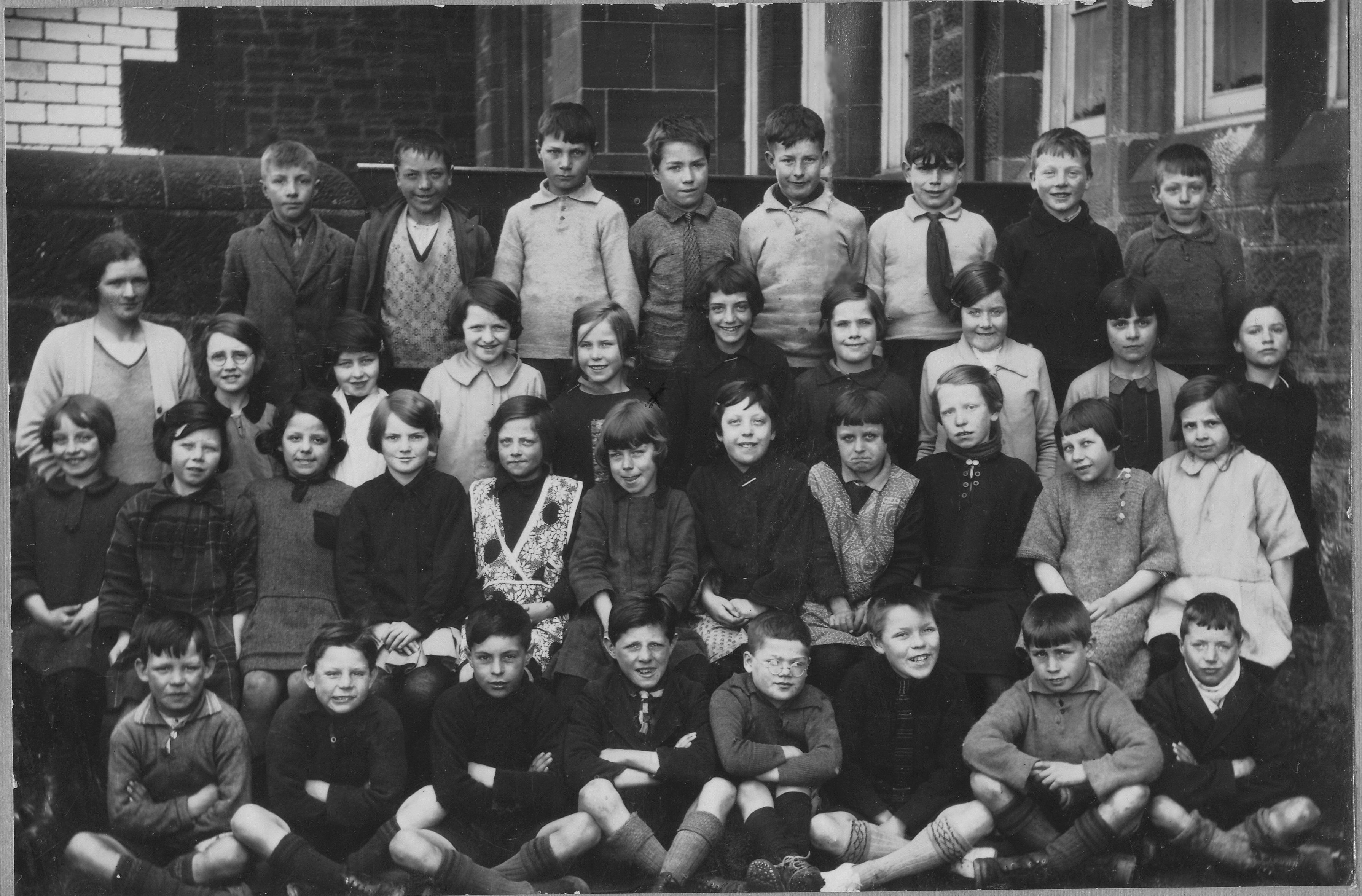 Bell, Margaret Harrison, Morag McDonald, Betty Robertson, Teacher: Mary Gibb.