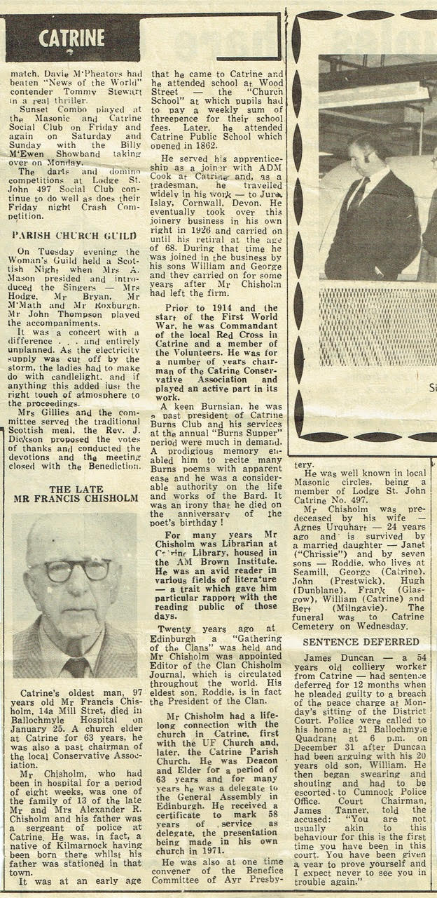 Below is a newspaper article from the Cumnock Chronicle with an obituary notice for the late Francis Chisholm who was a big part of Catrine's community. His Daughter Chissie was married to the local Chemist William Cochran and I have included some photos from Bill Cochran's grand daughter Susan Ballingall. Many thanks to Susan for sharing these family photos.