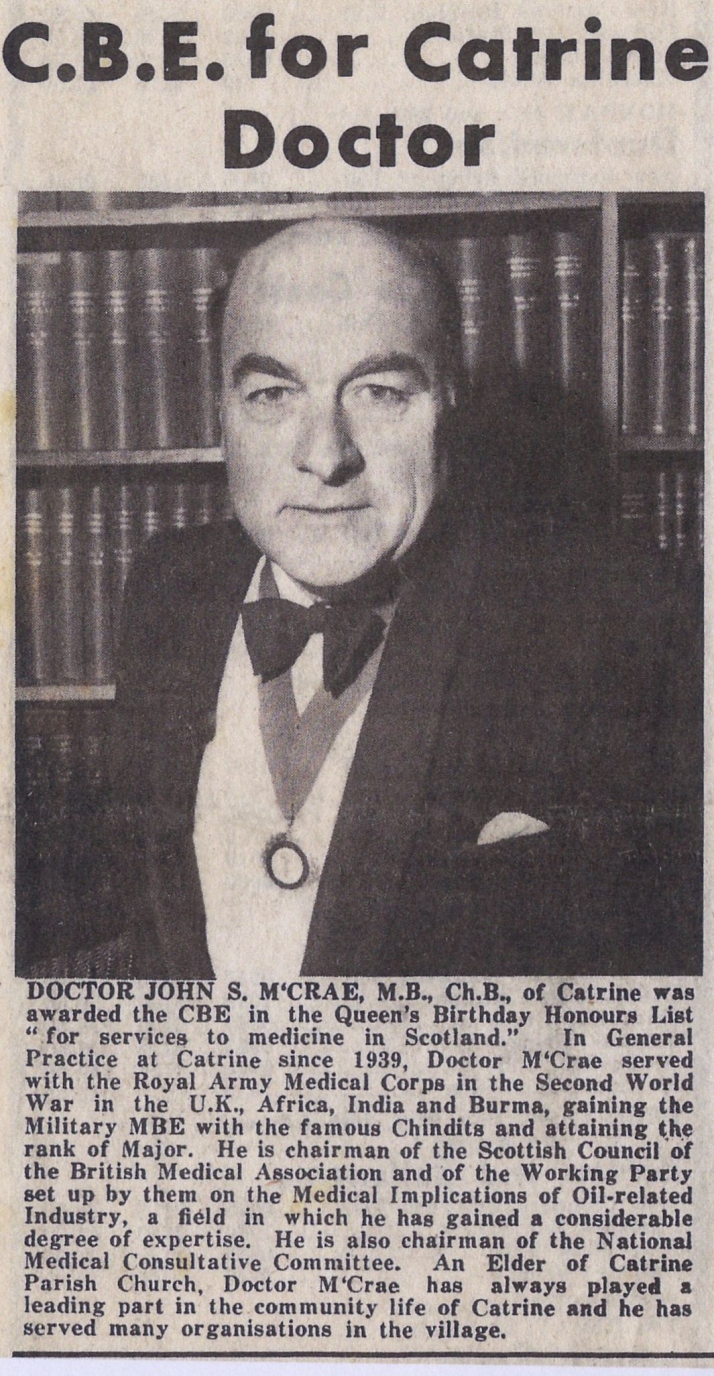 Dr G. D. Falconer, OBE, FRCS, secretary of the British Medical Association, came through from Edinburgh to pay tribute to Dr McCrae’s work for that body, saying it was most unusual to find a GP from a small country place like Catrine also playing an important role at the centre of the medical world on a national scale. But their guest had achieved this difficult task and he had never failed in his duties either at the BMA or here in Catrine. For this, great thanks had to go to his partner, Dr. Philip, who had proved most loyal and whose kindness had made it possible for Dr McCrae to play this important role in medical affairs. He recalled that Dr McCrae had served as a major with the RAMC in the Far East during the war and it was there that he met and married his wife. He had later become a member of the BMA and he was heavily committed to this work over the years, gaining a CBE for his services. He was a man of great character in the London council meetings where he had made a considerable impression. In Scotland he had reached the top of his profession and he was chairman of the first investigatory committee set up to probe the medical aspects and hazards of North Sea oil workers and divers. He was also chairman of the national medical organisation which gave expert advice to the Secretary of State. Dr Falconer, who had brought with him a BMA crest to present to Dr McCrae, remembered too late he already had one, and presented it instead to Catrine Primary School, the plaque being received by headmaster Mr. V. Campbell.