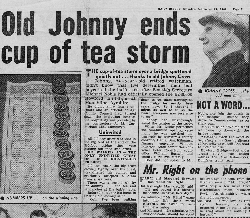 The councilors mentioned were boycotting the tea because the Tory secretary of state Michael Noble was opening the Bridge. Old Jock worked at the killing house as we knew it when my parents lodged with him in the 1940's and he moved on to being the site watchman for the council house's that were being built in the scheme at that time. It's hard to imagine what the new Howford Bridge would cost if it were being built today.