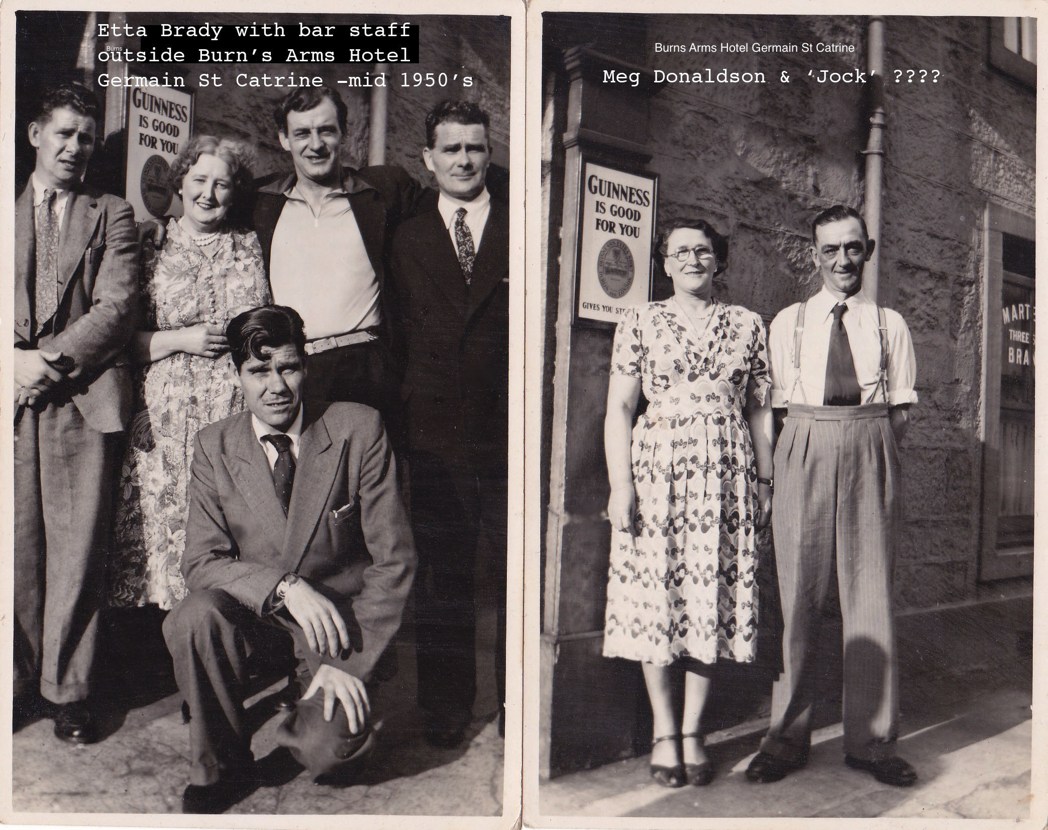 This picture on the left is from the mid 1950's of the owners and staff of the Burn's Arms in Catrine run then by 'Wullie' Brady and Etta his wife. Etta is on left picture, friend Meg Donaldson on the right. Meg was a widow from Glasgow. Guys are locals who worked in the evenings at weekends, I think some were miners. Jock, pictured with Meg, I think emigrated to Canada or the States with his family [he sent the Brady's back a coloured photo-very modern- of himself by a big saloon car] These pics may have been taken during some GB wide celebration. This information and these pictures were sent to me by Stewart Griffin who stayed in the Burn's in the mid 50's with his aunt and uncle. Anyone recognise any of the local faces from that time? Thanks to Stuart for sharing this picture with us.
