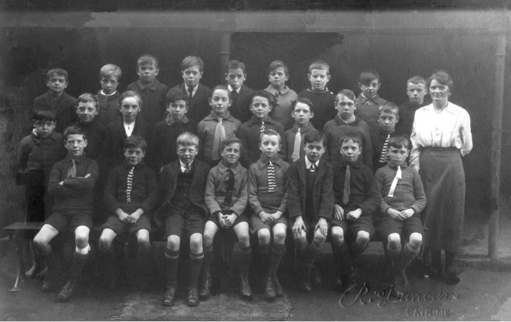 Catrine School 1922. [Some names we do have, no particular order] Willie Paterson, Davie Johnstone, Miss Milne [teacher], Willie Archibald, Alec Niven, Matt Taylor, George McDowall is second left in the front row and we know he was born in 1911. So we are guessing he is about 11 here.
